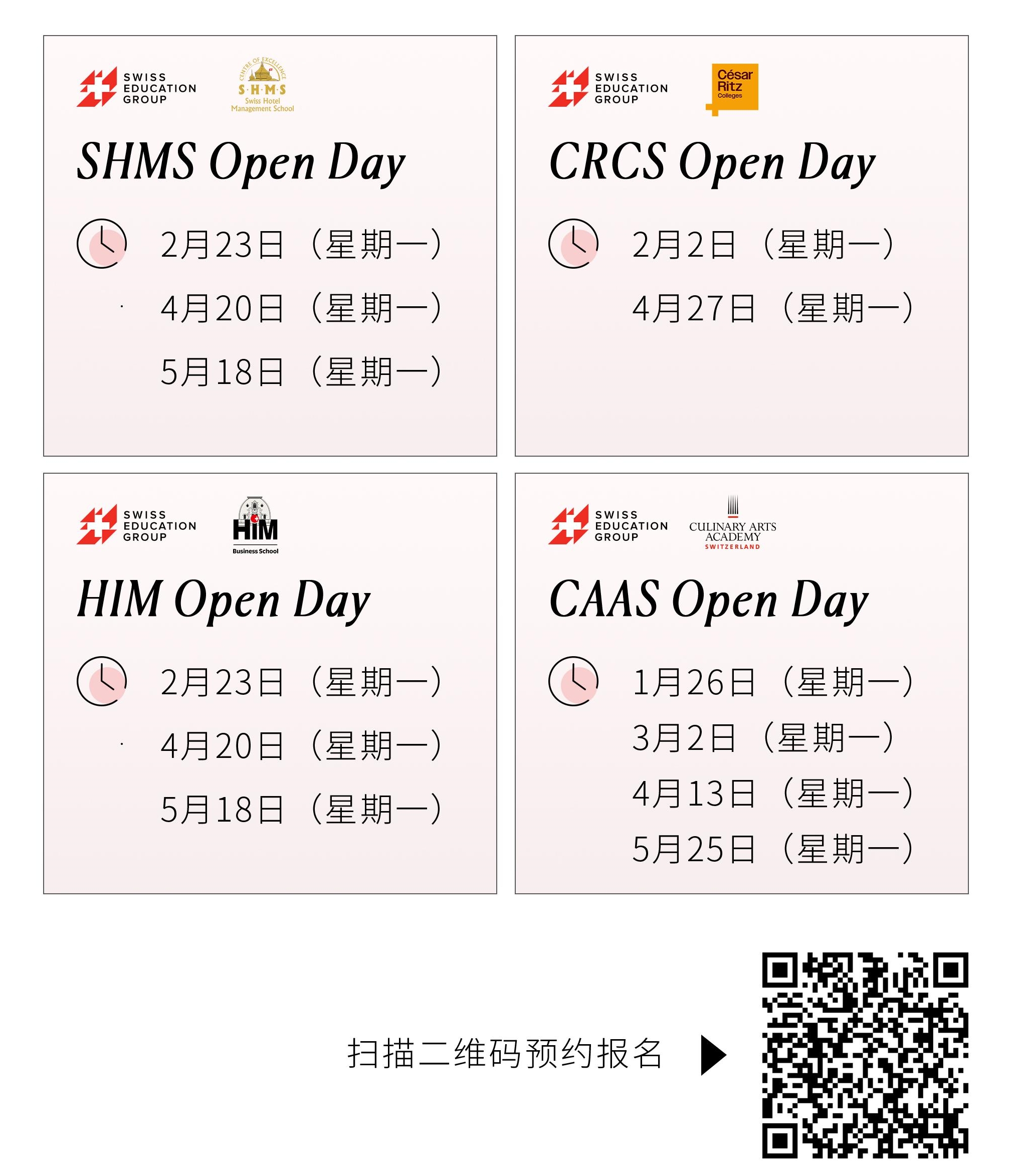 本次Open Day系列活动,以多校区、多时段、多选择的常态化形式,为中国学子搭建了直达瑞士校园的便捷桥梁。在这里,你可以亲身体验理论与实践紧密结合的教育理念,感受瑞士人文与自然交融的校园氛围,从风景如画的湖畔宫殿到活力四射的市中心校区,从专业的实训厨房到优雅的社交酒会,每一处场景,都在无声诠释着精英教育的精髓。